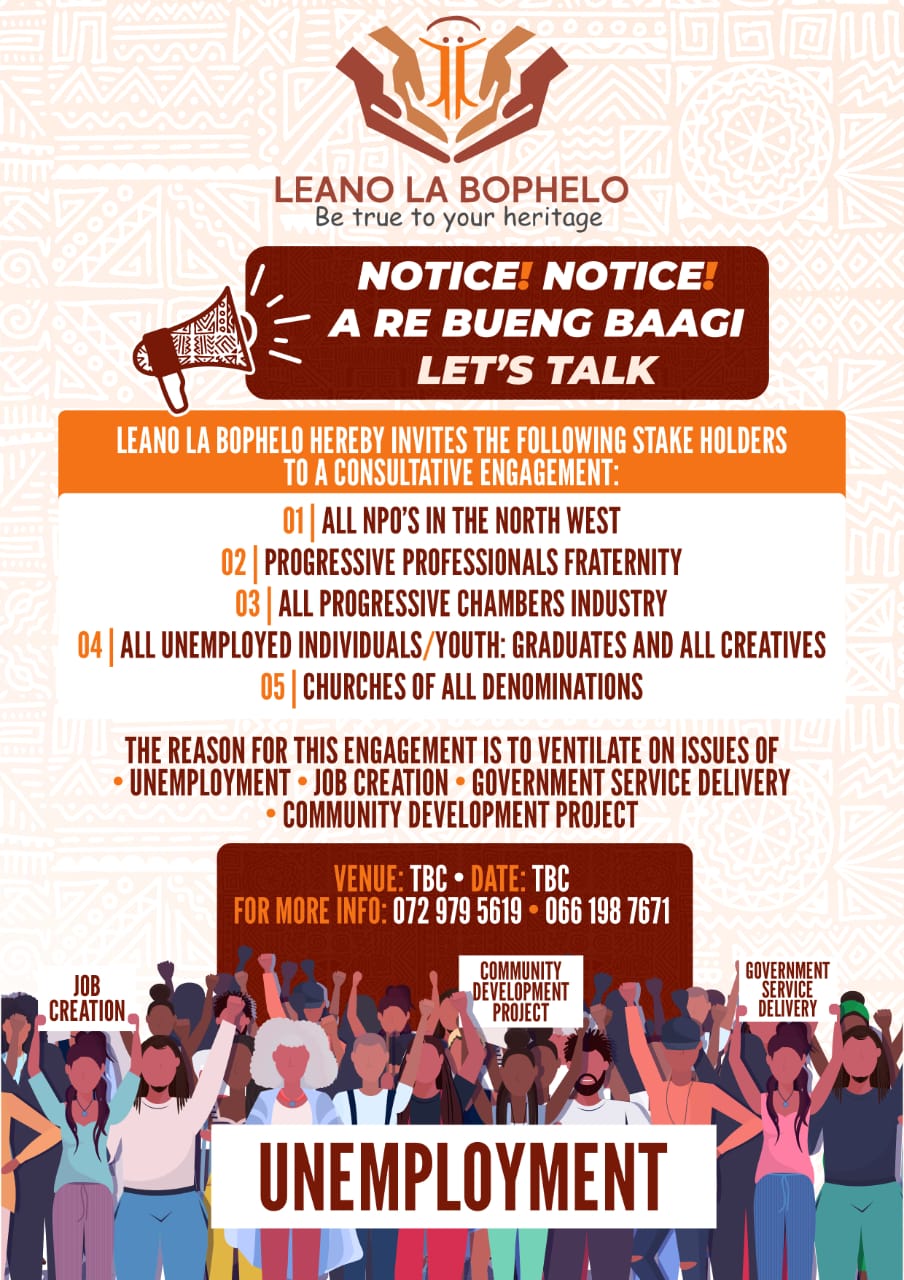The Leano La Bophelo Project (NPO) is a vehicle for delivering customer focused arts, culture and heritage interpretation, improved heritage, tourism destinations, and environment enhancements intended to make the Matlosana a historic environment that is intellectually accessible and enjoyable to visit upon by tourists and local residents.
